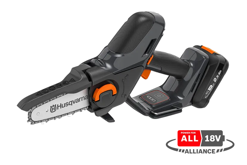 Compact handheld battery pruning saw, perfect for pruning trees, cutting down garden waste and smaller carpentry work. Built on our proven chainsaw expertise, this all-around mini pruning chainsaw is robust enough to easily cut branches 75mm wide. Equipped with an easy and tool-free replacement of chain and bar and improved safety with an anti-slip handle and automatic shutdown when left unattended. Storage is made easy with the included hook and part of the 18V POWER FOR ALL battery systems.